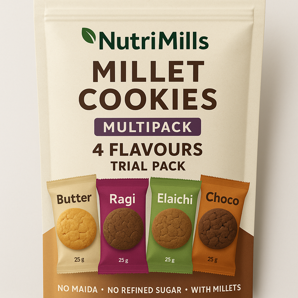 Indulge in the wholesome goodness of NutriMills Millet Cookies Multipack – a delightful assortment of four delicious flavours: Butter, Ragi, Elaichi, and Choco. Crafted with nutrient-rich millets, these cookies are a healthier alternative to regular biscuits, free from maida and refined sugar. Perfect for tea-time treats, guilt-free snacking, or as a thoughtful gift for loved ones, each cookie offers a unique taste and the nourishment of whole grains.